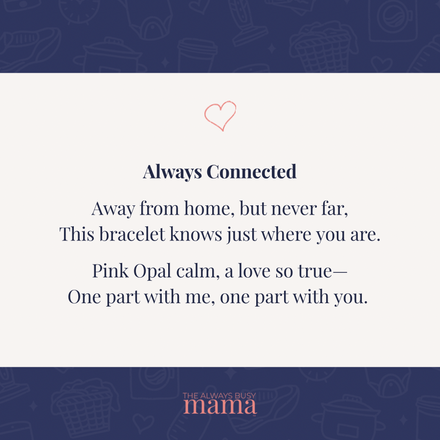 Included: One adult + one child bracelet with Pink Opal and a heart charm. Optional poem/message card available.