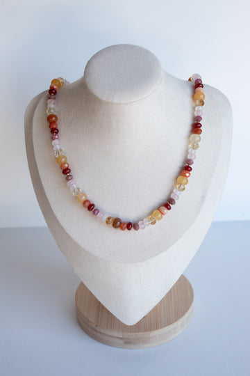 Golden light, crisp leaves, and the warmth of fall captured in one timeless piece. The Autumn Glow Necklace blends thulite, AAA citrine, AAA red agate, AAA rose quartz, yellow aventurine, red Botswana agate, and white jade—each gemstone reflecting the richness of the season. Accented with gold, this chunky beaded necklace is both bold and meaningful, a radiant reminder of joy, abundance, and love.