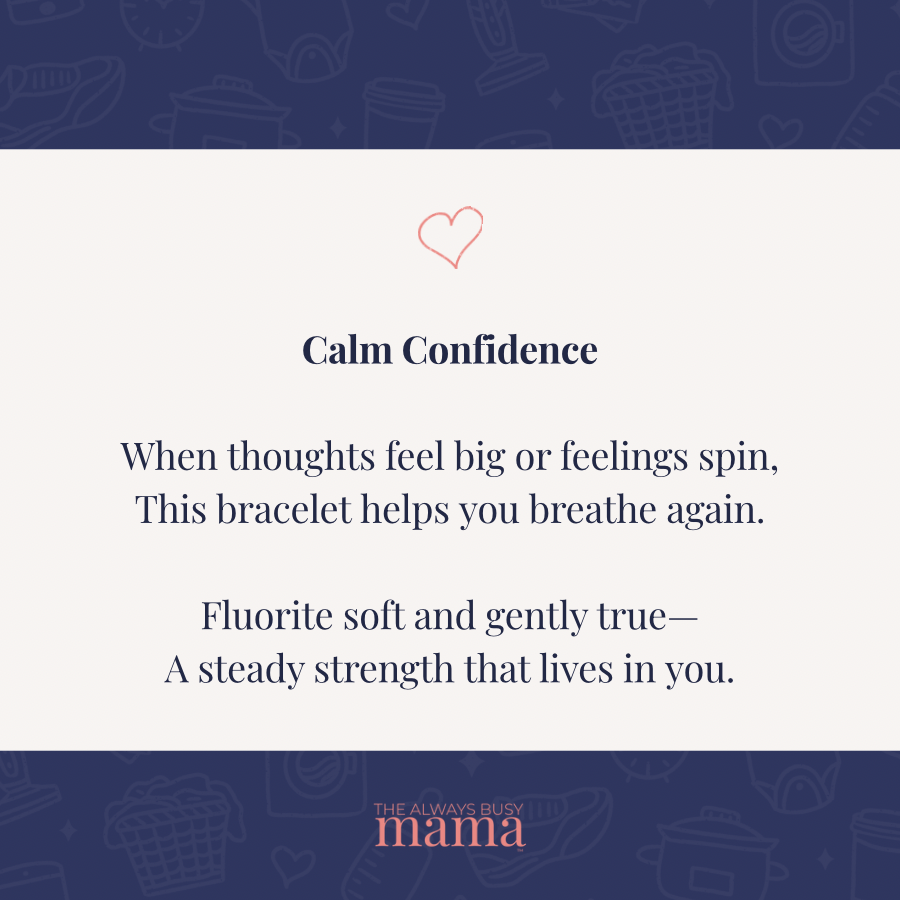 Whether itβs a crowded room, a loud lunchroom, or big feelings that seem to come out of nowhere β the Calm Confidence Set helps her feel more centered. Fluorite clears emotional fog and helps her move through the day with peace and focus. The Mother of Pearl heart is a soft reminder that sheβs supported and held, always.