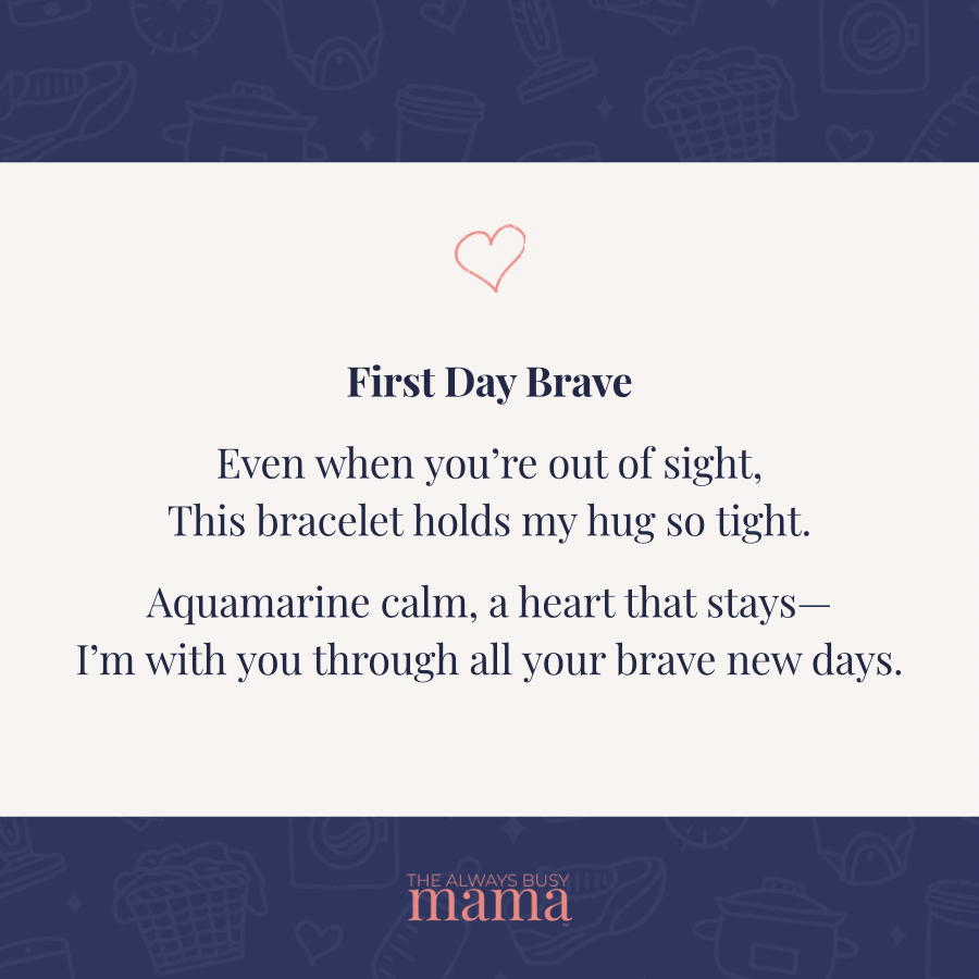 Included: One adult + one child stretch bracelet in Aquamarine with a heart charm. Optional keepsake poem card available.